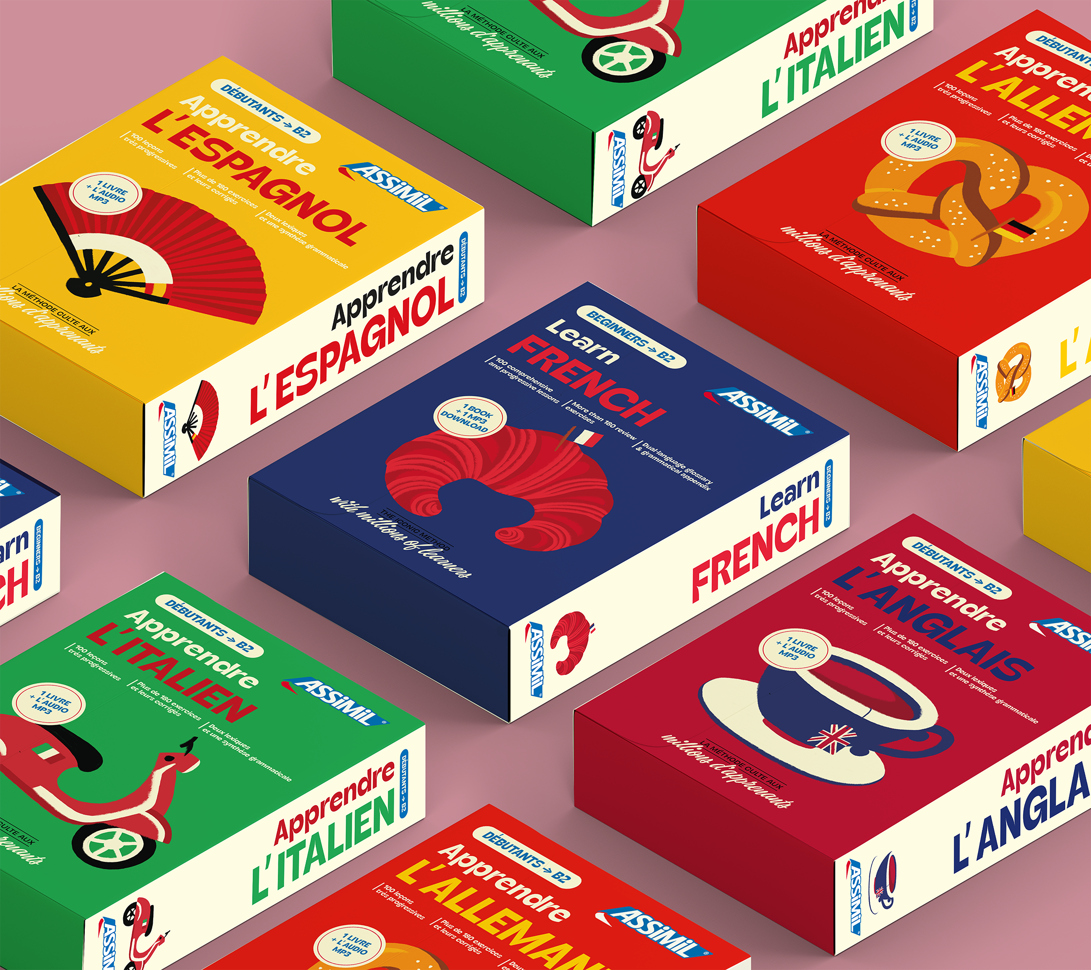 Les Éditions Assimil nous confient la conception des coffrets de cinq titres de leur méthode emblématique.