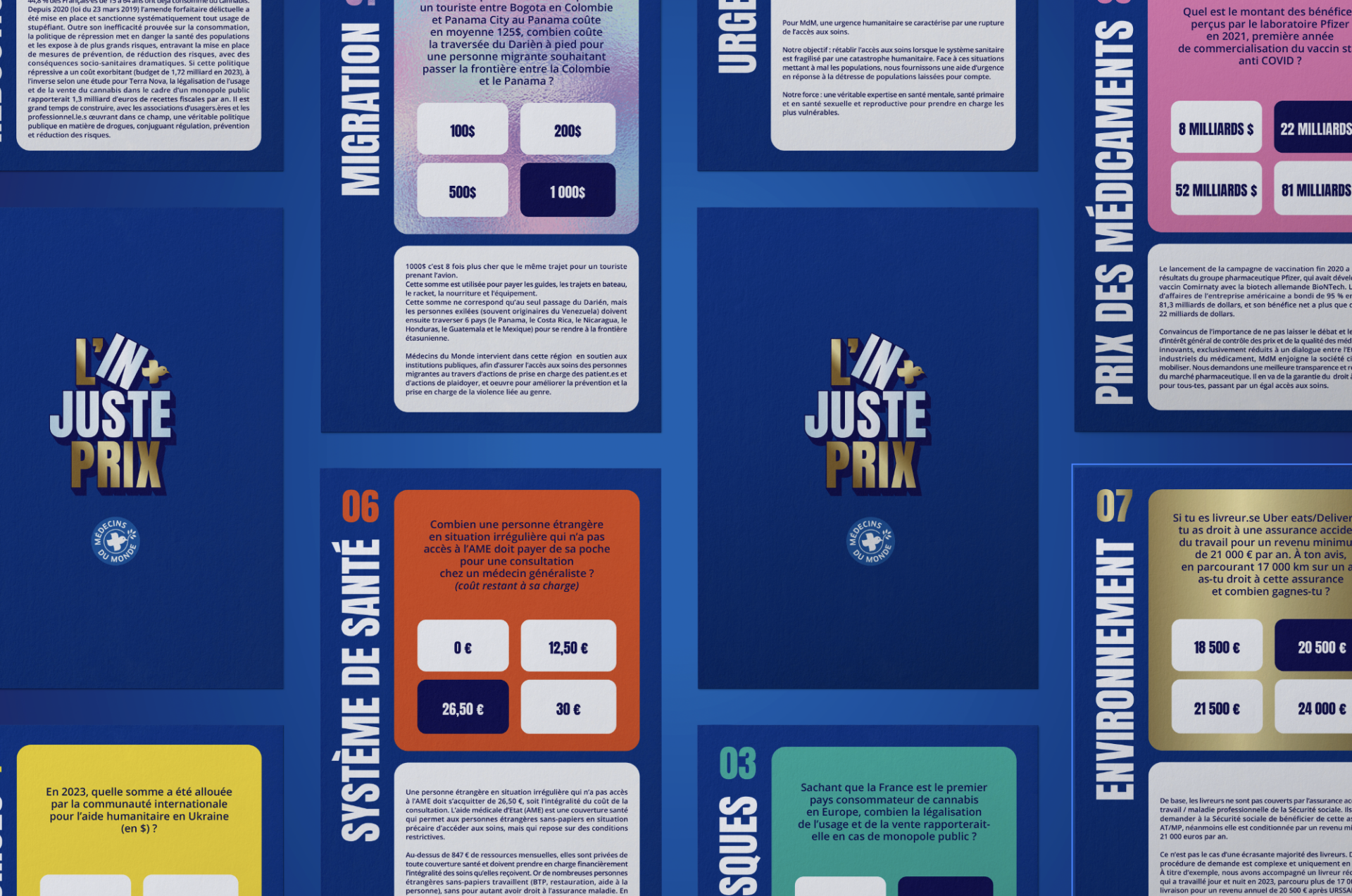 Chaque année Médecins du Monde organise une opération de sensibilisation ludique pour le stand des Solidays et autres festivals : un jeu et une animation permettant de sensibiliser les festivaliers aux combats de l’ONG. En 2024, c’est le jeu le Juste prix qui servira de modèle. Le message principal sera le coût financier, humain, matériel d’accès à la santé. Ils confient à Commequoi la création de l’identité graphique, la mise en page de l’ensemble des éléments du jeu et du stand la recherche, la gestion et le suivi de fabrication du jeu en 2 exemplaires.
